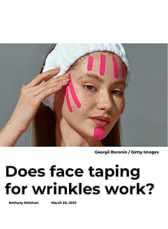There are two distinct techniques used when it comes to face taping. “One is applying a gentle adhesive to areas of the face that crease with movement, with the thought that preventing the face from wrinkling will make it appear smoother,” explains Dr. Kristy Hamilton, a plastic surgeon in Texas and chair of the American Society of Plastic Surgeons social media subcommittee. “The other is when clear tape is applied discreetly at the temples, cheek and jawline and connected behind the head with an elastic band in order to gently lift the brows, cheeks and jowls.”