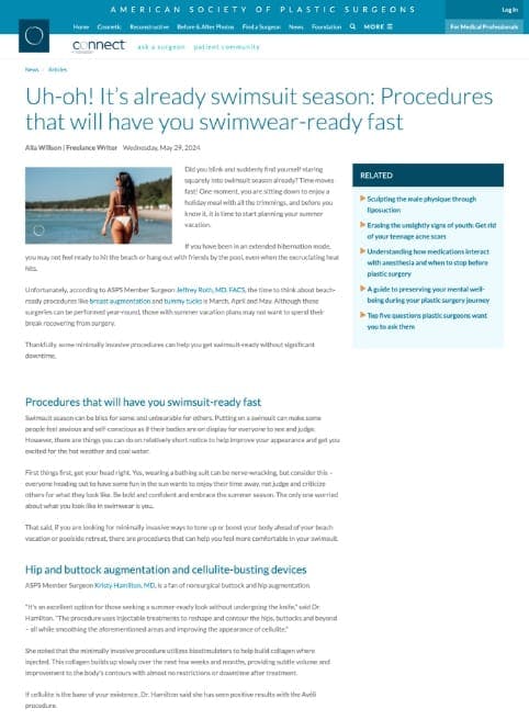 “ASPS Member Surgeon Kristy Hamilton, MD, is a fan of nonsurgical buttock and hip augmentation. ‘It’s an excellent option for those seeking a summer-ready look without undergoing the knife… The procedure uses injectable treatments to reshape and contour the hips, buttocks and beyond – all while smoothing the aforementioned areas and improving the appearance of cellulite.’ … Dr. Hamilton said she has seen positive results with the Avéli procedure. ‘This is a minimally invasive procedure that can be performed under local anesthesia to release the fibrous bands that create the cellulite dimples (thus permanently eliminating them)… It works impressively well.'”