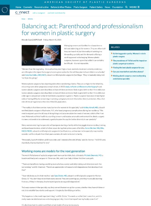 “Managing careers and families has always been a delicate balancing act for women. They are often told they can have it all, but the reality of working in a demanding specialty and the demands of being a working parent is challenging. Women plastic surgeons, however, agree that while it can certainly be difficult – it’s not impossible.”