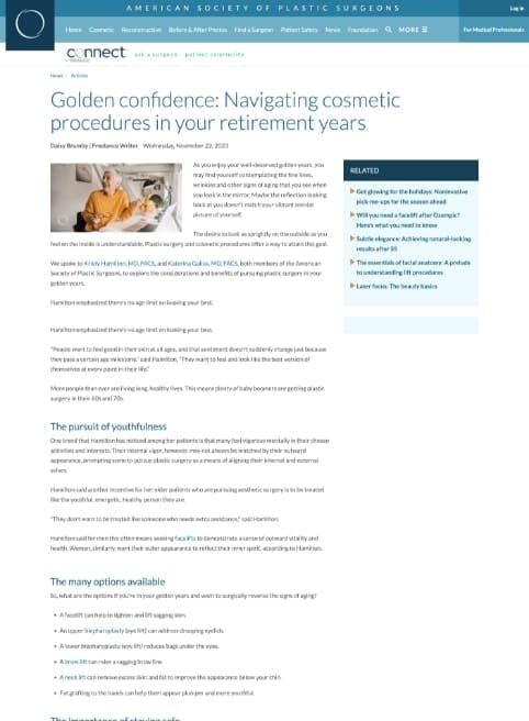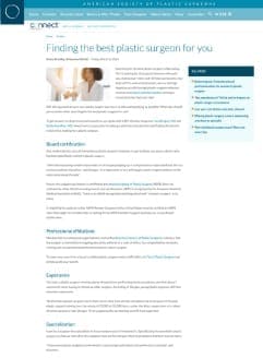 “Hamilton highlighted the importance of choosing a board-certified plastic surgeon who is a member of the ASPS (American Society of Plastic Surgeons). ‘You have to do your research and look at the work and feel comfortable with the whole team of people – surgeon, nursing staff, front desk,’ said Hamilton. ‘Make sure that you feel cared for as a patient wherever you go.'”