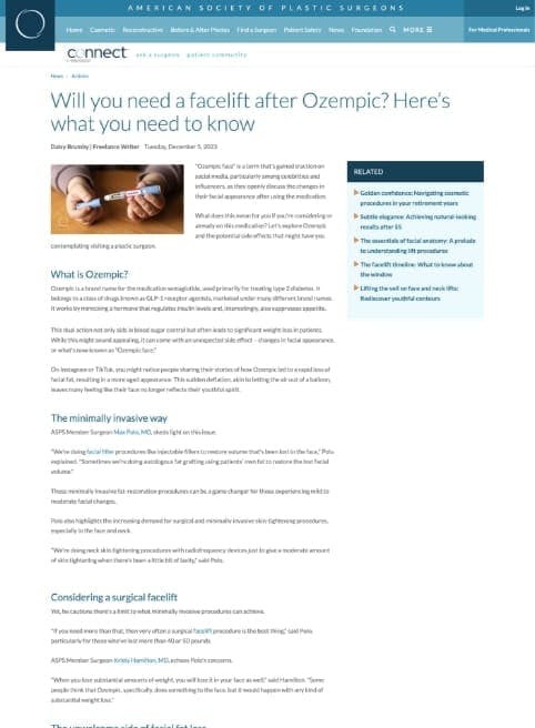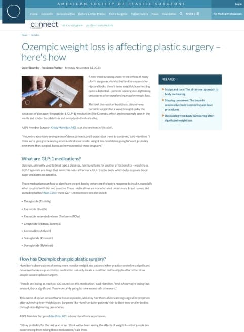 “ASPS Member Surgeon Kristy Hamilton, MD, is at the forefront of this shift (patients seeking skin-tightening procedures after experiencing massive weight loss)… ‘Yes, we’re absolutely seeing more of those patients, and I expect that trend to continue,’ said Hamilton. ‘I think we’re going to be seeing more medically successful weight loss candidates going forward, probably even more than surgical, based on how successful these drugs are.'”