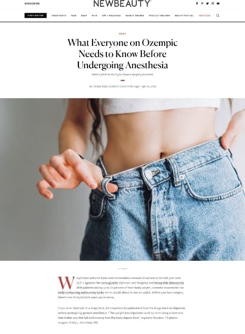 “‘The weight-loss injections work by mimicking a hormone that makes you feel full and slow how the body digests food,” explains Houston, TX plastic surgeon Kristy L. Hamilton, MD. ‘I advise patients to be off of it (semaglutide like Ozempic/Wegovy or tirzepatide like Mounjaro) for four weeks from a nutritional perspective to improve healing after surgery.'”