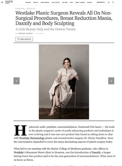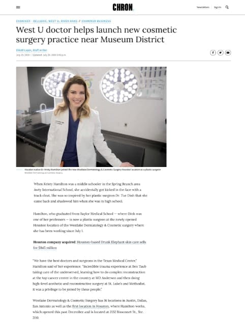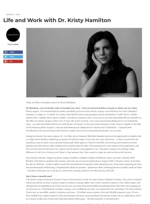 Plastic surgeon Dr. Kristy Hamilton is delighted to be named “Top Doc” in Cosmetic Surgery by her peers: Houstonia Magazine, Fall 2022.