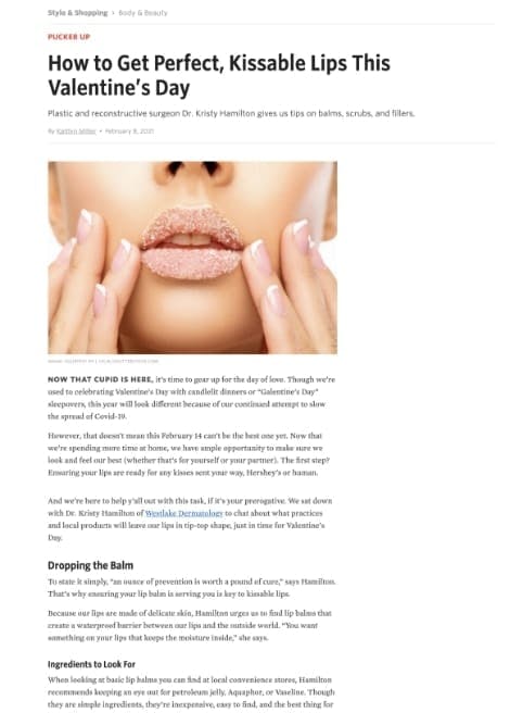 “As a lip-filler expert seeing multiple patients a week, Hamilton assures us that this simple procedure can be the key to a much-needed confidence boost. ‘When people think of lip filler it can be a scary thought because you think of ‘duck lips’ or things that don’t look natural,’ says Hamilton. ‘But lip fillers done well should look very natural and absolutely beautiful… [creating] younger, radiant-looking lips.'”